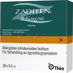 Akuuttien allergisten silmäoireiden ensisijaiseksi hoidoksi suositellaan antihistamiinisilmätippoja, kuten atselastiinia, ketotifeeniä tai levokabastiinia. Natriumkromoglikaatti on antihistamiinisilmätippoja heikompitehoinen allergisten silmäoireiden lievittämisessä. Natriumkromoglikaattitippojen käyttö tulee aloittaa ennen allergiaoireiden ilmaantumista, ja käyttöä on hyvä jatkaa säännöllisesti koko allergiakauden ajan. Sekä antihistamiinisilmätippoja on saatavilla sekä pullossa että kerta-annospipetteinä. Jos oireet eivät helpota riittävästi pelkillä silmätipoilla, hoitoon voidaan lisätä suun kautta otettava antihistamiini.